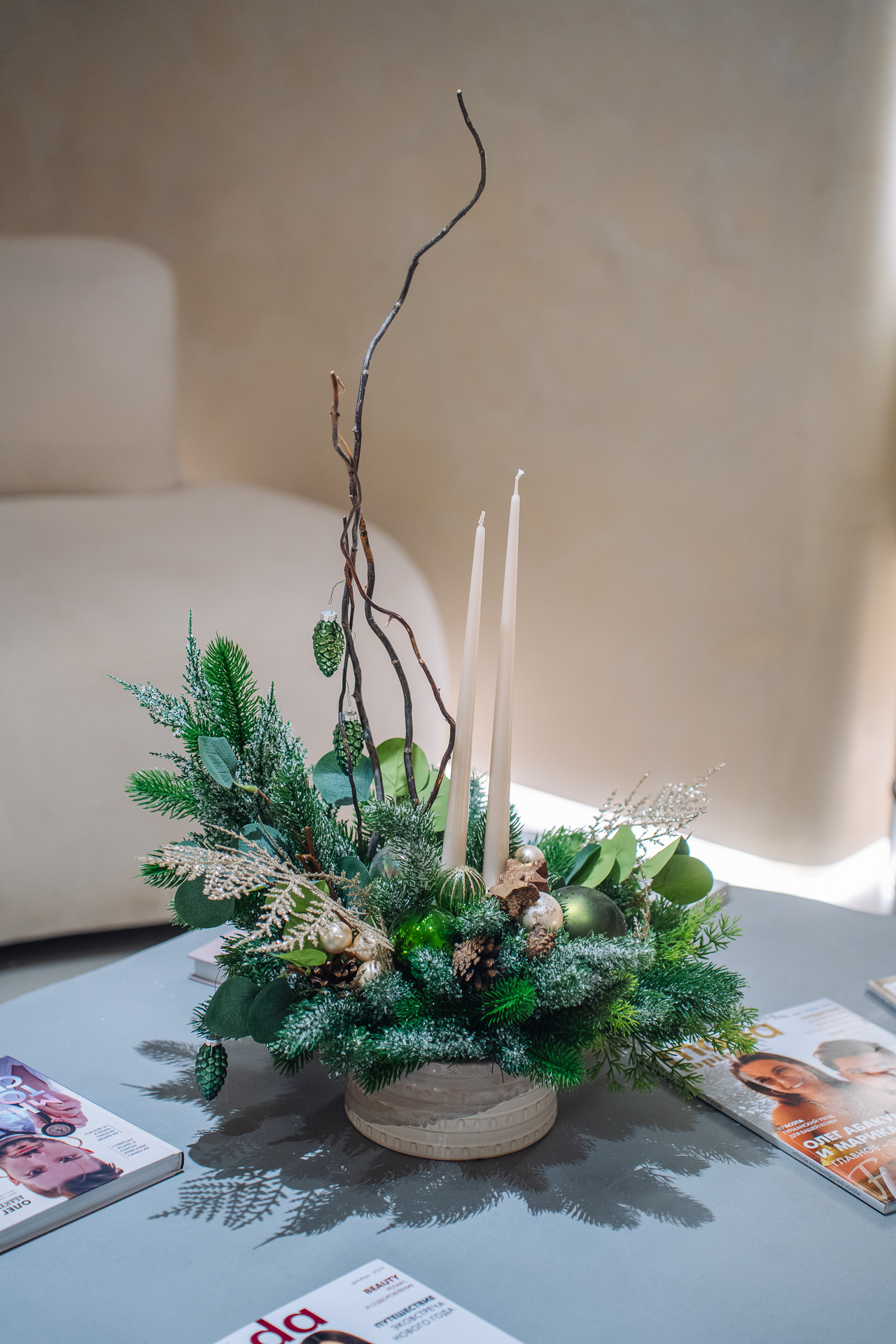 - Композиции с шишками: шишки, покрытые матовой золотой или медной краской, в сочетании с хвойными ветками и свечами.