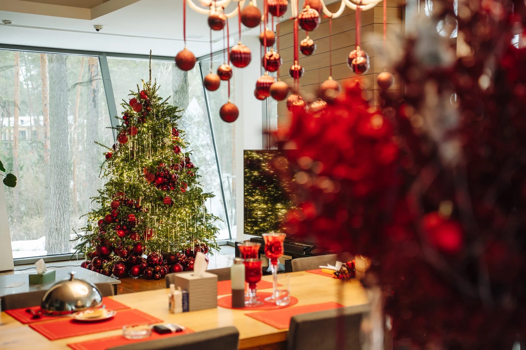- Крупные украшения: большие шары из стекла насыщенных красных тонов с золотым покрытием, хрустальные сосульки и подвески, фигурки лошадей из блестящей бронзы или зеркального акрила.