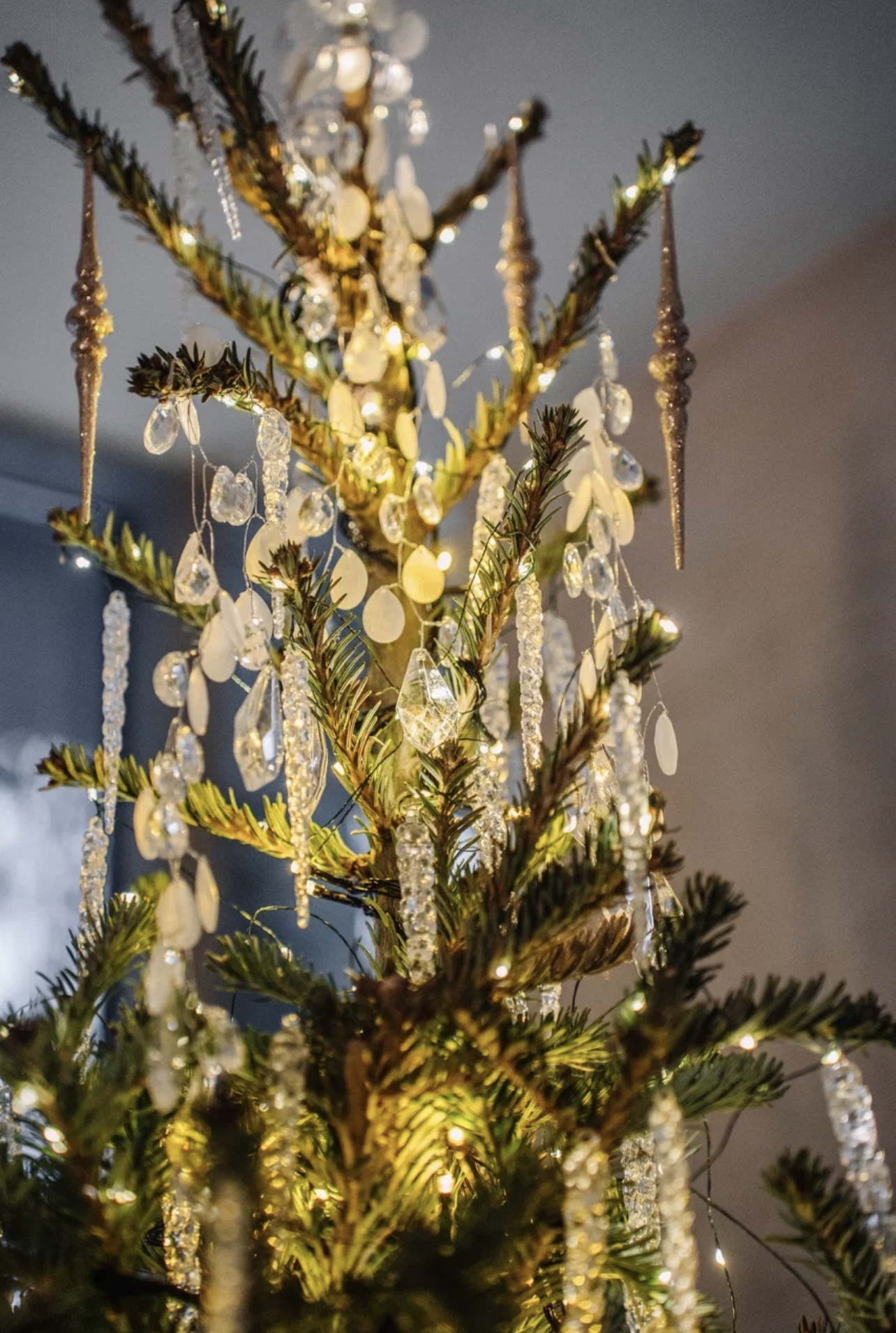 - Игра света: гирлянды с теплым желтым светом, напоминающим пламя свечей. Прекрасно подойдут гирлянды с хрустальными элементами.