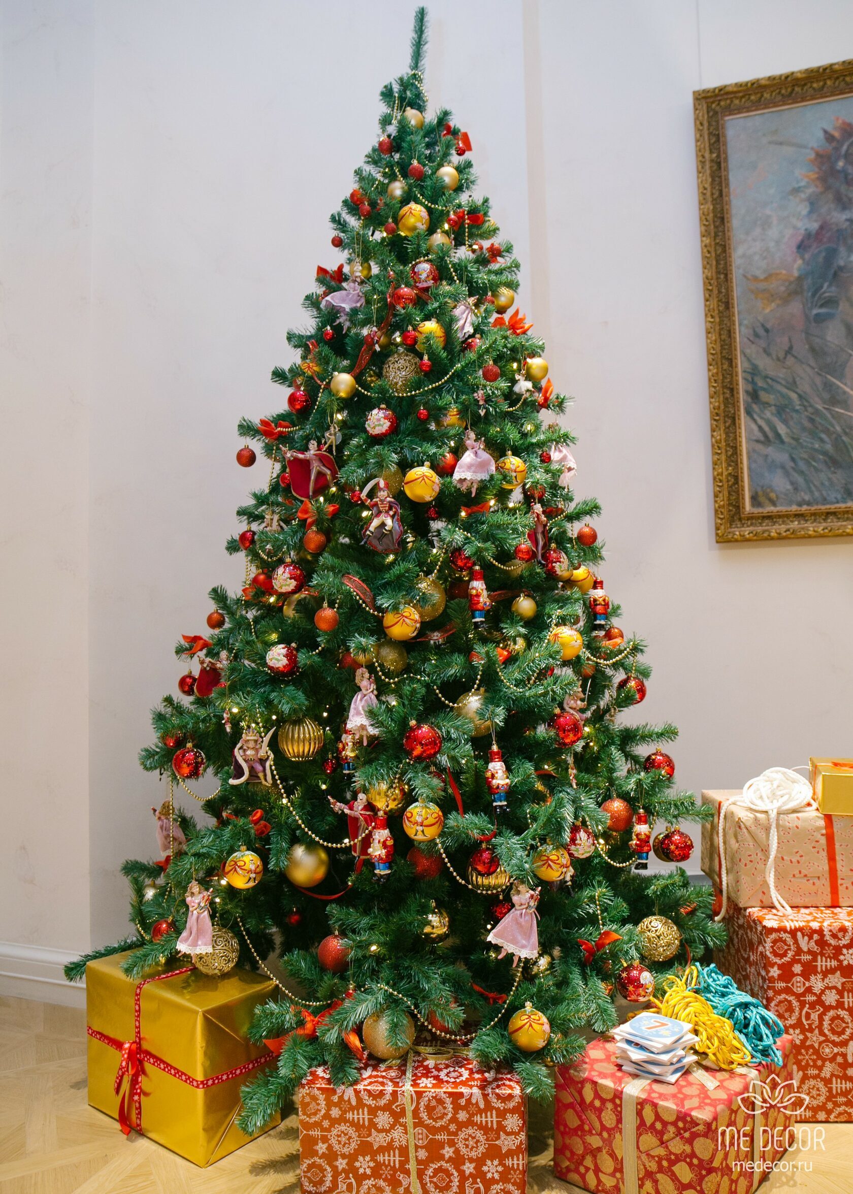 - Элементы ручной работы: звезды из войлока, расписные деревянные шары в народных традициях (как хохлома или гжель, идеально вписывающиеся в красно-золотую палитру), деревянные кони-качалки и матрешки в новогодних нарядах.